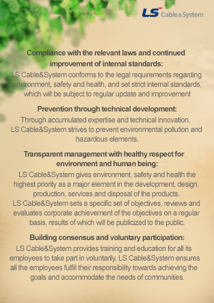 LS Cable&System gives environment, safety and health the highest priority as a major element in the development, design, production, services and disposal of the products. LS Cable&System sets a specific set of objectives, reviews and evaluates corporate achievement of the objectives on a regular basis, results of which will be publicized to the public.